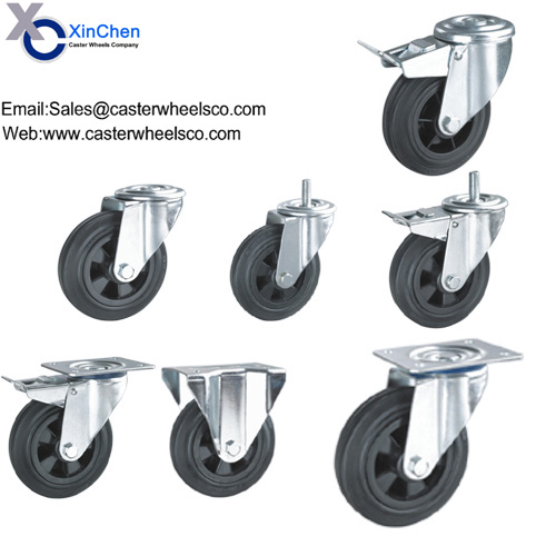 Industrial rubber caster wheels,Rubber wheel with PP core.Purpose: Garbage bin caster wheels,Trolley caster wheels.Model option: Rigid,swivel plate,Bolt hole,With and without brake.